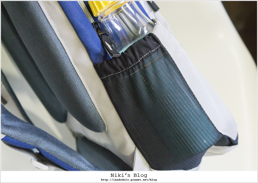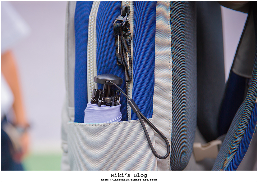 書包兩側,左邊袋子裝摺傘、右邊袋子有做彈性網布設計可裝水壺