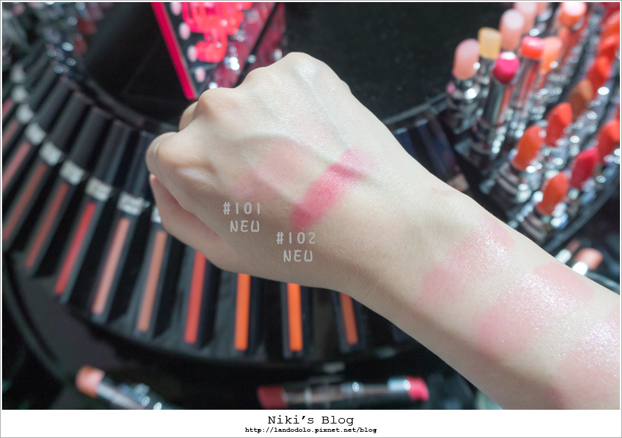 粉霧粉紅#101、漿果粉霧#102 雖是霧光唇膏,質地依舊滑順不卡很好塗