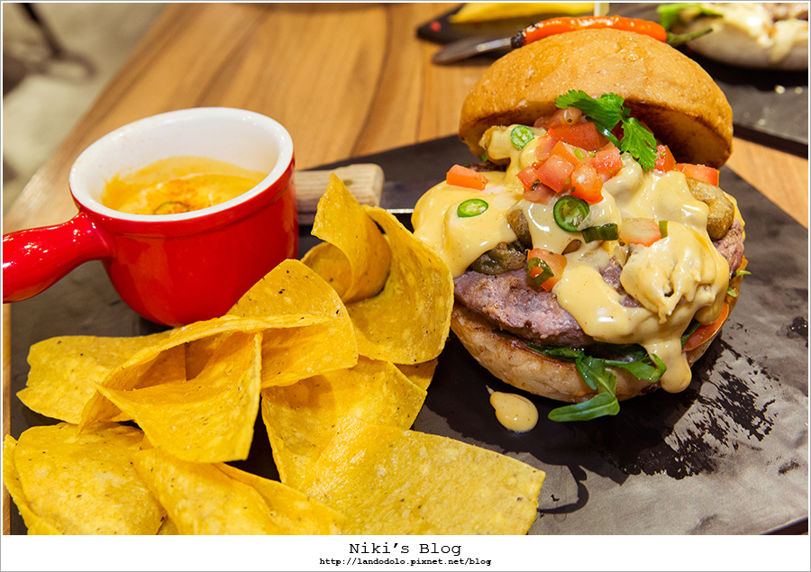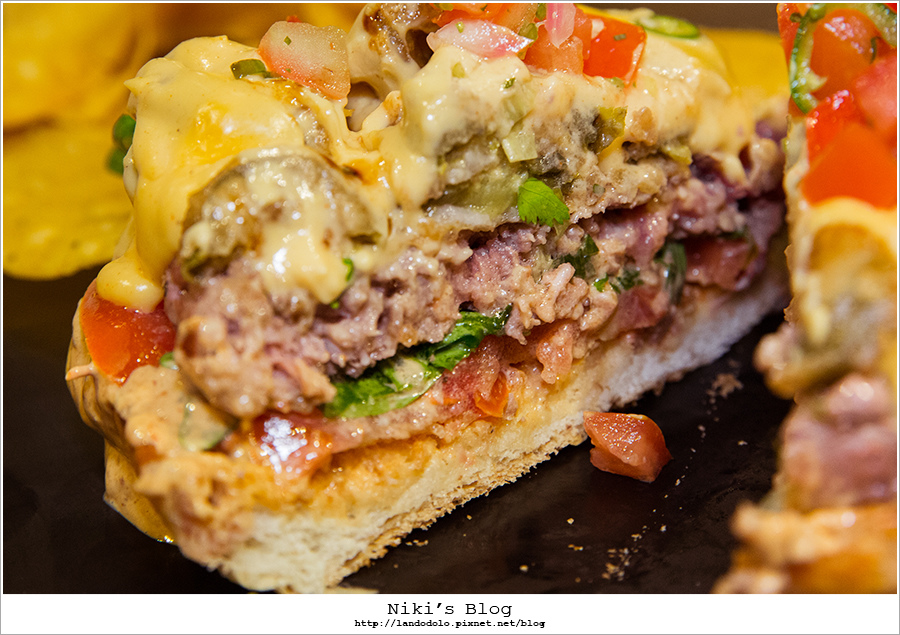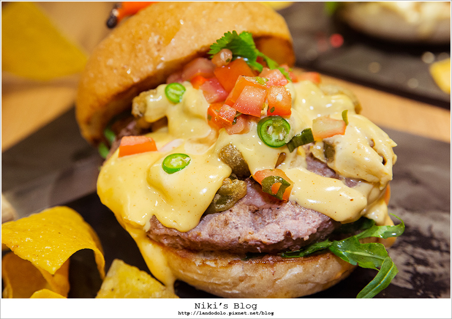 酥炸墨西哥辣椒、青辣椒莎莎,夾著多汁的牛肉漢堡排