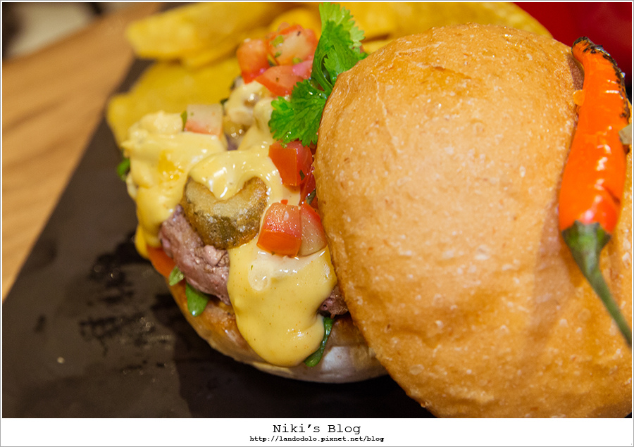 漢堡頂端插著烤得微焦紅辣椒..好想咬一口(貪吃鬼~什麼都不想放過)