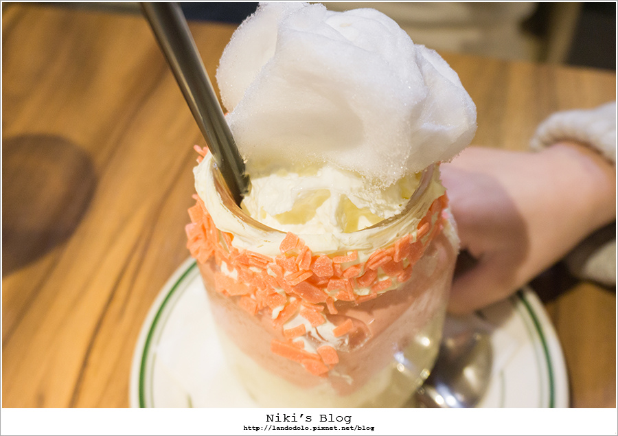 香草冰淇淋加上優格和草莓,還有模擬白雲的棉花糖球球