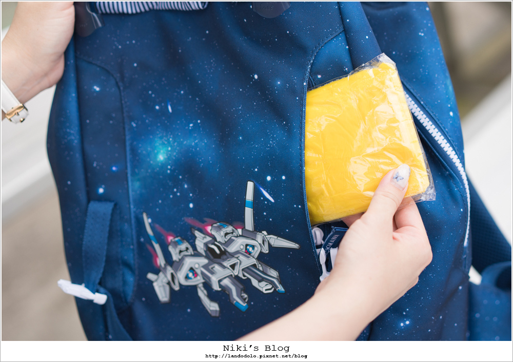 書包正面拉鍊隔層可以收納雨衣、面紙、鑰匙等小物