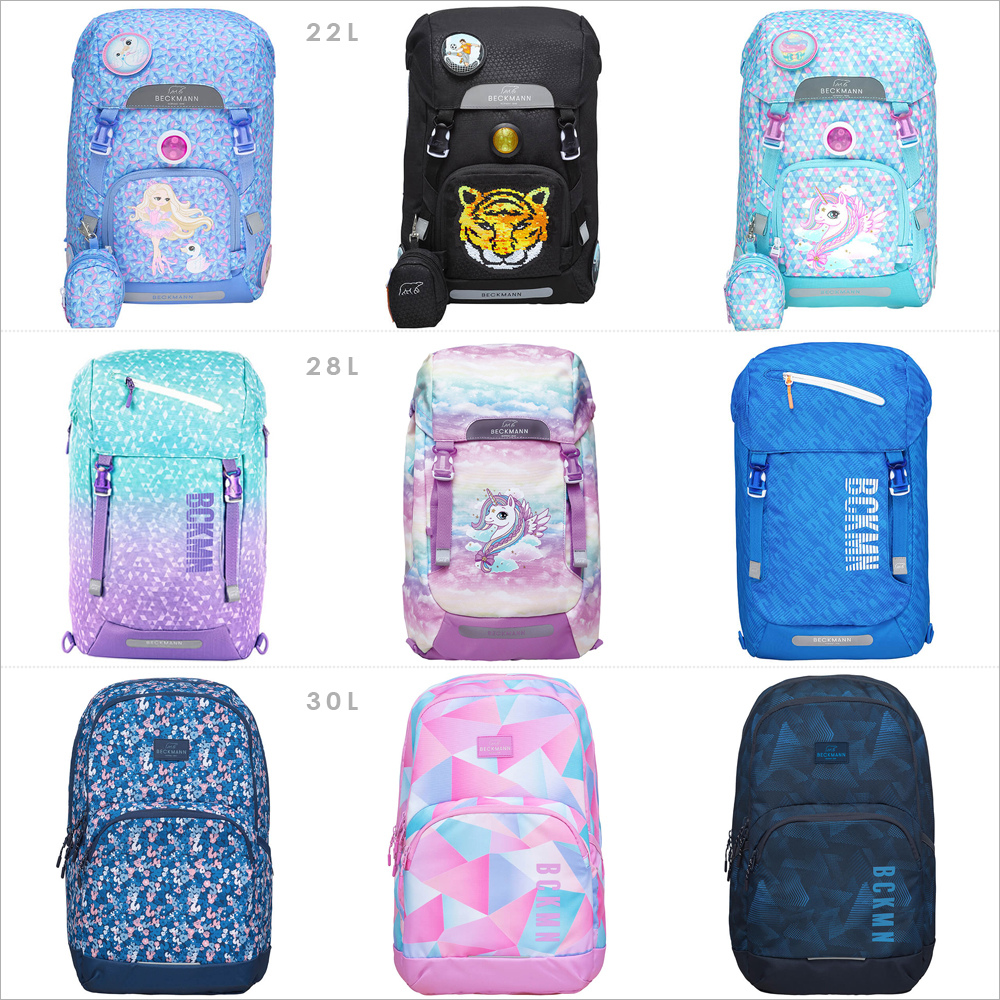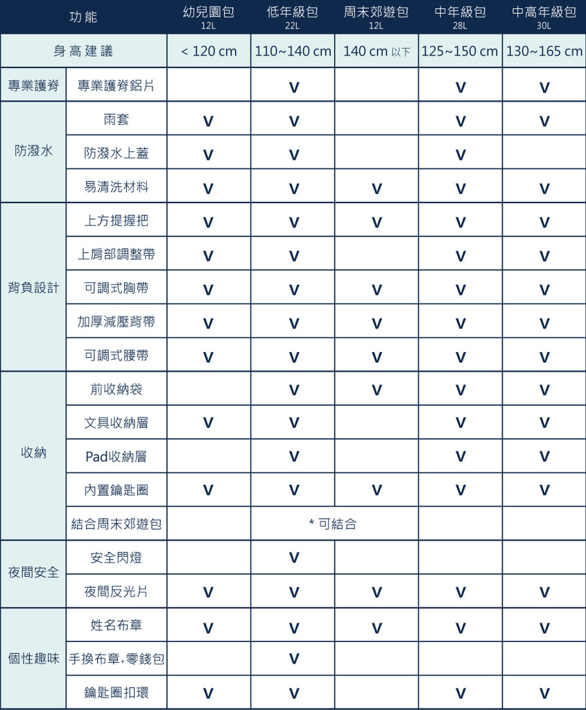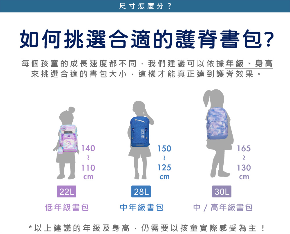 30L適合130~165cm,高年級的孩子,採用的系統皆相同,只是書包造型更簡約