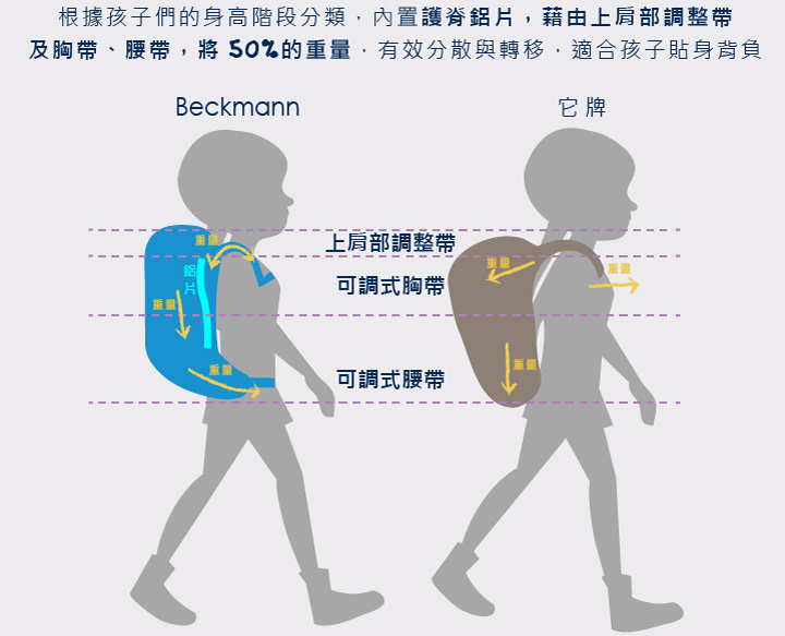 可調式腰帶:轉移書包50%重量分散到臀部,降低肩膀壓力,幫助孩子不要彎腰駝背