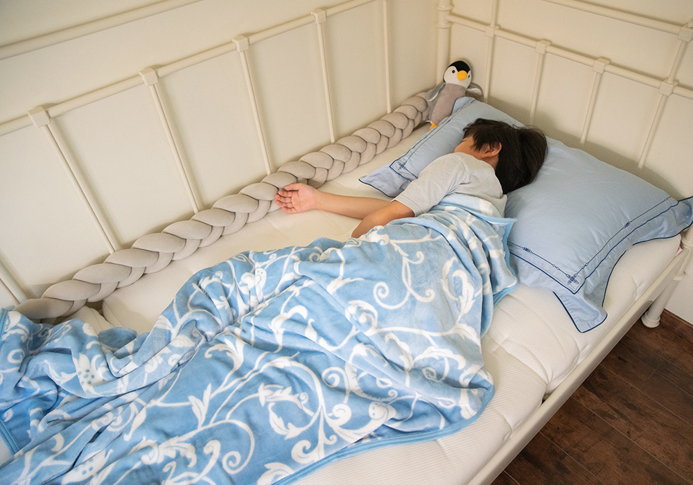睡覺時床墊溝縫位於下半身,大人睡大約在膝蓋以下,兒童睡大約在小腿以下,