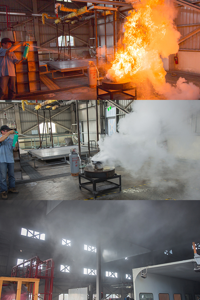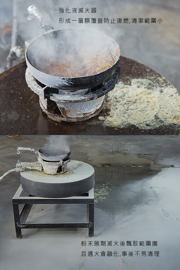 我有在防火試驗場見識過中性強化液滅火器與一般乾粉末火器的差異,